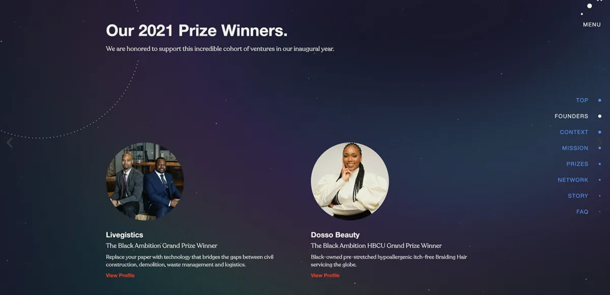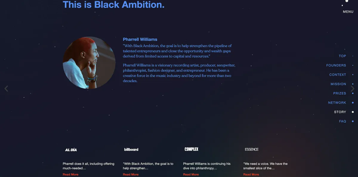 Founded by recording artist, producer, songwriter, and entrepreneur, Pharrell Williams. Black Ambition Prize’s goal is to help strengthen the pipeline of talented entrepreneurs and close the opportunity and wealth gaps derived from limited access to capital and resources. This involves multiple blog posts, website strategy, back-end development using JavaScript, PHP, CSS, Etc. and overall website management, which we take lead on to assure the best optimal performance. Services Website Management Web